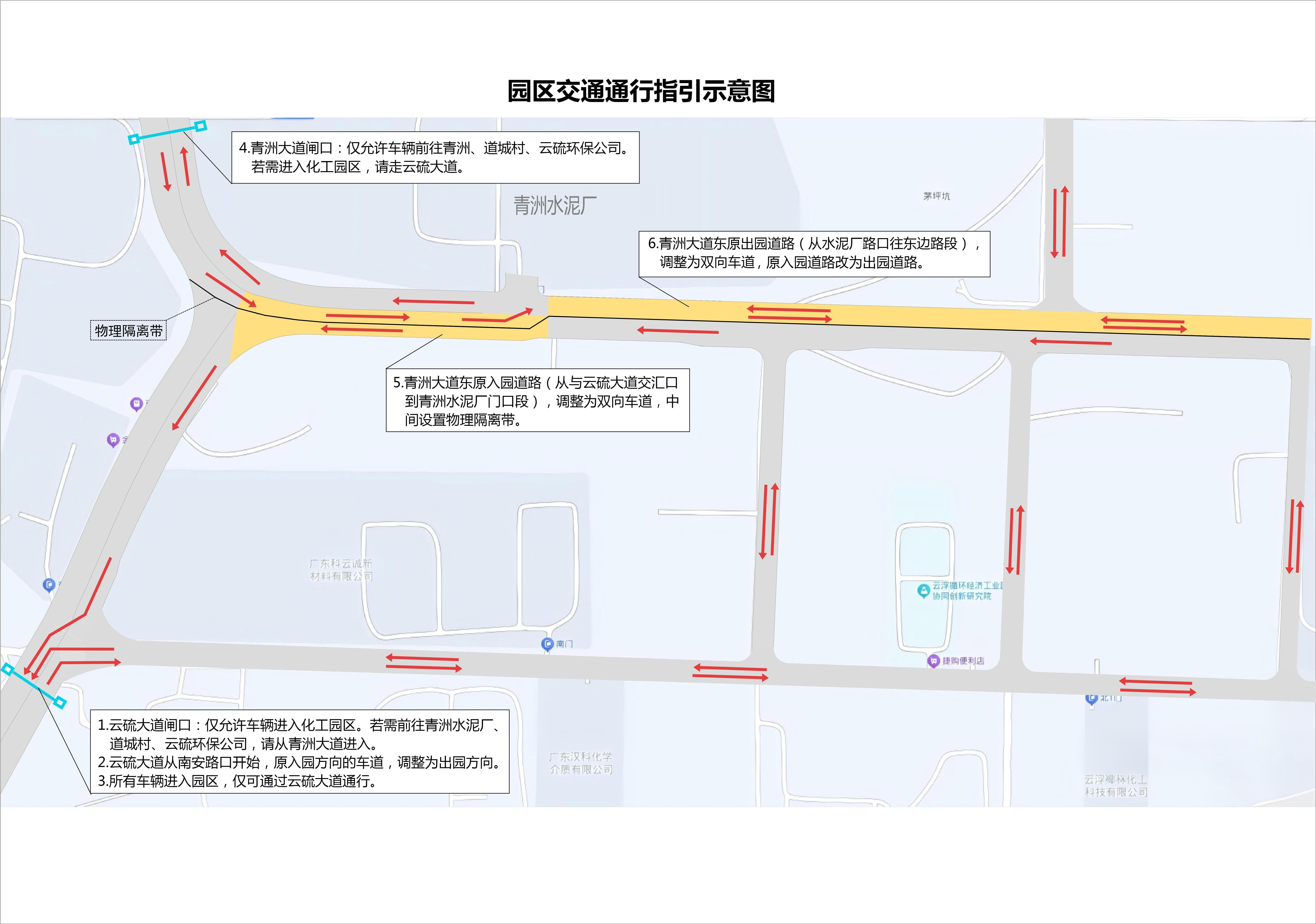2.保留云硫大道闸口,园区业务车辆、人员请由云硫大道入园,沿云硫大道(入园)→南安路→创新路(云海路、信安路)→青洲大道东→云硫大道(出园)。
