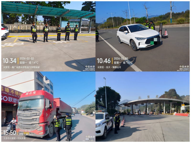 严查违法行为,净化运输市场秩序。交通运输执法人员联合公安交管部门在国道324线、省道368线、高速出入口及云浮东高铁站周边路段等重点地段设立临时检查站,重点打击春运期间客车非法营运、异地违法运营、超限超载、非法从事网约车营运、班车非法揽客和出租车拒载、议价等违法违规行为。