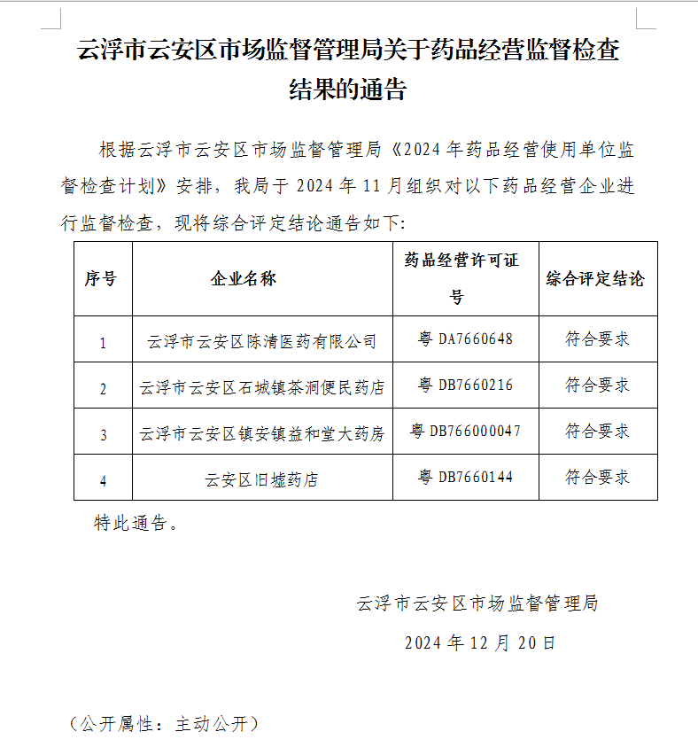 云浮市云安区市场监督管理局关于药品经营监督检查结果的通告